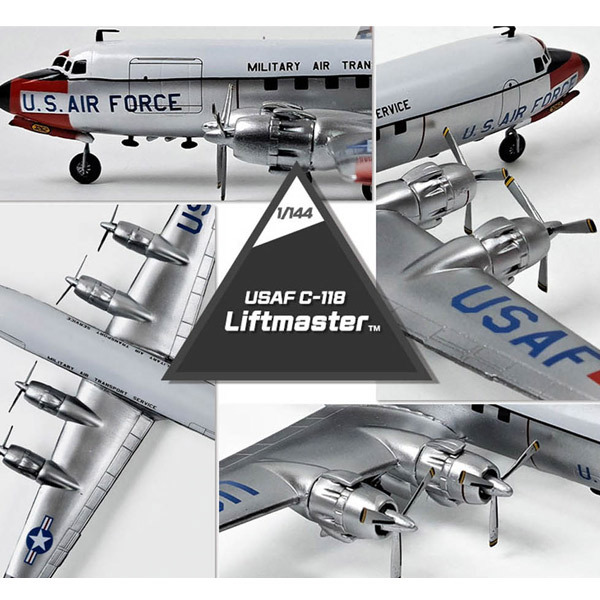 The Douglas DC-6 was introduced in 1946 as a military transport and commercial airliner. The DC-6 was developed based on the US Army's request for a longer version of the Douglas DC-4 with a pressurized cabin. The Liftmaster was adopted by the US Air Force and Navy. Many still fly today in cargo and wildfire control roles. This 1/144 scale model of the Douglas DC-6/C-118 Liftmaster features seven marking options. The finished model is 22.8 cm long and 5.3 cm high.