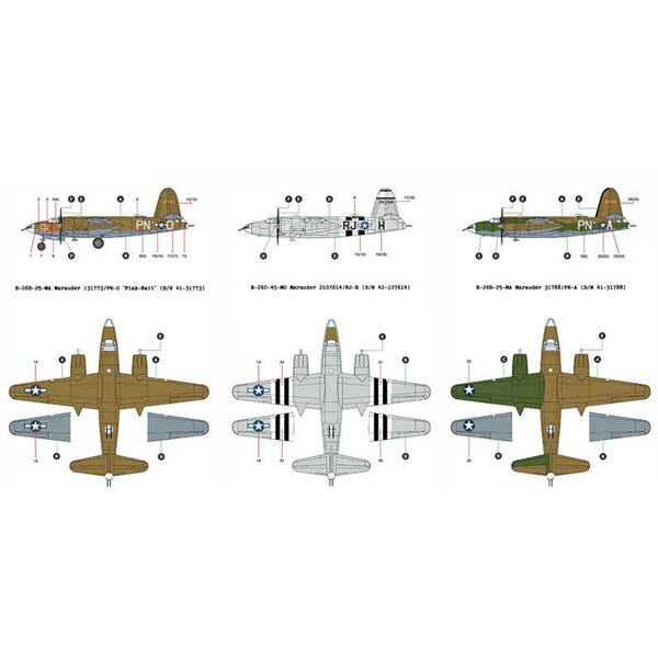 Choice of 3 markings: (1) B-26B-25-MA Marauder 131773/PN-O “Flak-Bait” (S/N 41-31773); (2) B-26C-45-MO Marauder 2107614/RJ-H (S/N 42-107614); (3) B-26B-25-MA Marauder 31788/PN-A (S/N 41-31788).