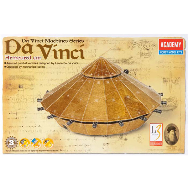 Beautifully detailed, step-by-step instructions make assembly of these working models a breeze.  By engineering a clockwork wind-up motor into the design of da Vinci's 16-gun combat vehicle armoured car, this snap together vehicle will travel across the desk of students, collectors, and mechanical engineers, both young and old