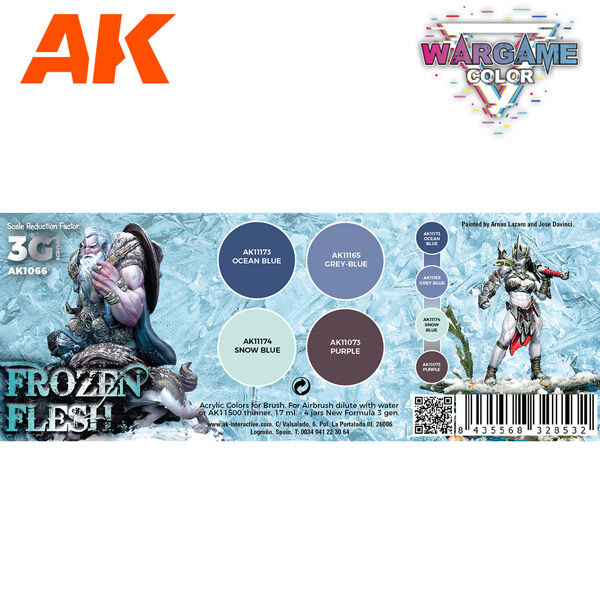 This Third Generation set contains a selection of colours to paint frozen flesh with brush using transitions, illuminations and glazing techniques on figures. It includes 4 tones to combine easily for making a realistic effect and to make the typical frozen aspect of the flesh with subtle shades bruised from frostbite.