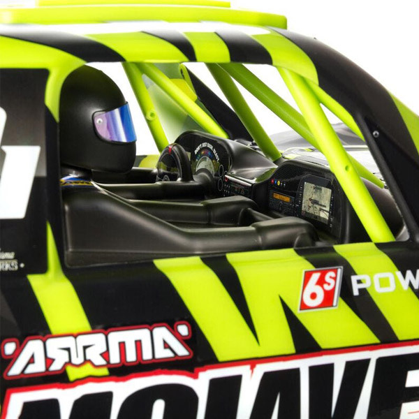 Multi-terrain dBoots® FORTRESS™ tyres on multi split-spoke wheels give your MOJAVE™ 6S BLX Desert Truck the grip to get up, over, or through anything in your way. And it doesn't just perform like a winner. It looks like one, too, with a painted and decaled desert truck body, colour-coordinated roll cage and roof rails, and even a detailed cockpit.