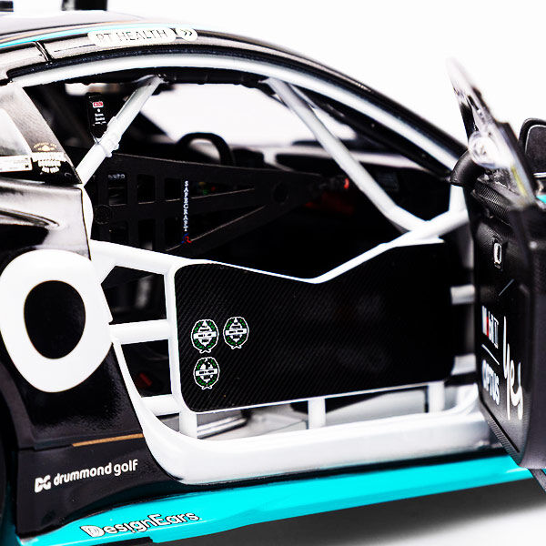 A highly detailed racing cockpit can be seen through the moulded clear glasshouse, or by opening the doors to examine the interior further. Under the bonnet includes a detailed 5.4 litre Coyote quad overhead cam V8 and engine bay surround. Underneath the model, the undercarriage details the unique Gen3 floorpan.