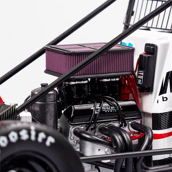 It also features removable mud covers and engine hood, so you can choose just how you want to display the model in your collection with poseable steering and the distinctive block tread Hoosier Sprint tyres, which means this model can be displayed in an aggressive “opposite lock” stance..