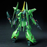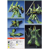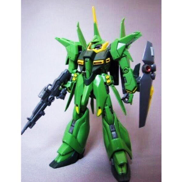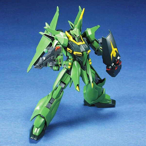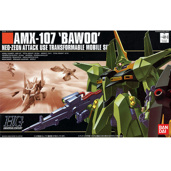 The AMX-107 Bawoo makes its (re)appearance in 1/144 scale in the HGUC line, this time moulded in green instead of red! This kit transforms from flight to fight mode just like it does in Gundam ZZ.