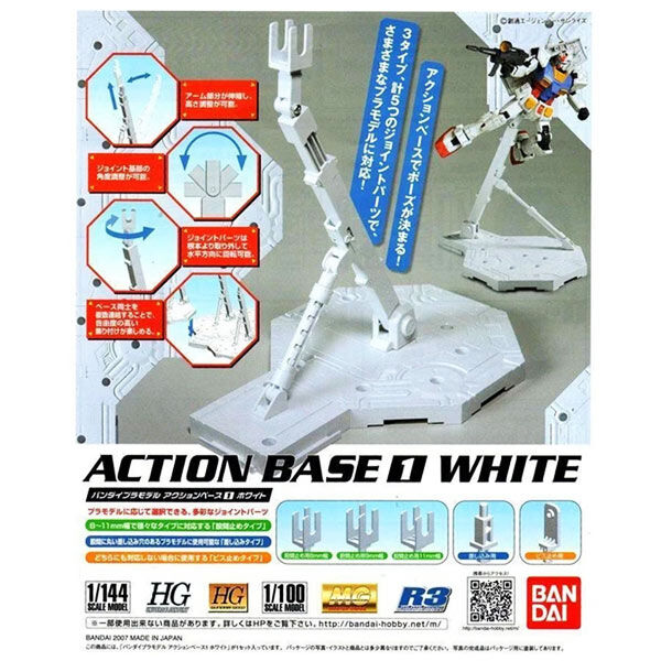Bandai's Action Base is designed to hold kits from their SD Gundam, 1/144 scale models, HGUC, HG Gundam Seed, 1/100 scale models, MG, and Real Robot Revolution series. Action Base 1 is a plastic injection snap fit assembly kit that requires very little work to assemble. No cement or paint is required!