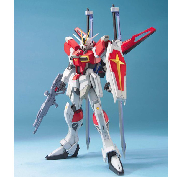 The Sword Silhouette pack, carried by the Silhouette Flyer, can be attached to the Mobile Suit's back to transform it into the formidable Sword Impulse Gundam. The kit comes complete with an array of weapons, including a pair of Anti-Ship Laser Swords that can be combined into a double-bladed sword, a Beam Rifle, two Assault Knives, and an openable shield. The wing section of the Sword Silhouette pack can be detached for use as a giant boomerang or turned into a pair of Flash Edge beam boomerangs.