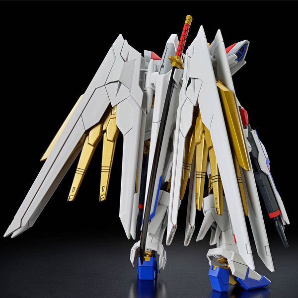The new High Grade kit presents the Mighty Strike Freedom Gundam from "Mobile Suit Gundam SEED Freedom," offering an immersive experience with its specialised internal structure called the "SEED Action System." This system enables dynamic posing with individual hip joint connections in each leg. The gold parts, made with Real Metallic Gloss Injection material, shine with enhanced metallic luster. The wings are highly articulated for expanded configurations, featuring 8 sliding joints for accurate deployment. 3D metallic stickers add a luminous effect, while the sword's blade parts boast varied textures. Various display options include removable "Proud Defender," interchangeable parts for the forehead cannon, and extendable hip rail gun for firing positions. Armaments like beam sabers and shields provide additional customisation possibilities.