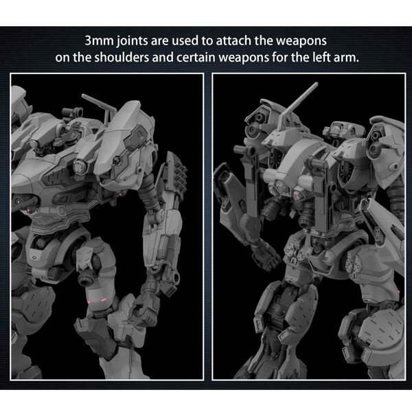 The model uses 3mm joints to attach both shoulder weapons and some left-hand weapons, offering a wide variety of assembly options. It also comes equipped with the LR-036 CURTIS rapid fire linear rifle.