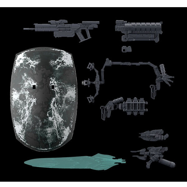 Included weapons are the RF-024 TURNER, HI-32: BU-TT/A, BML-G1/P07VTC-12, and SI-24: SU-Q5. Some weapons can change shape depending on whether they are equipped on the left or right side, with separate parts provided for each configuration, offering selective assembly options.