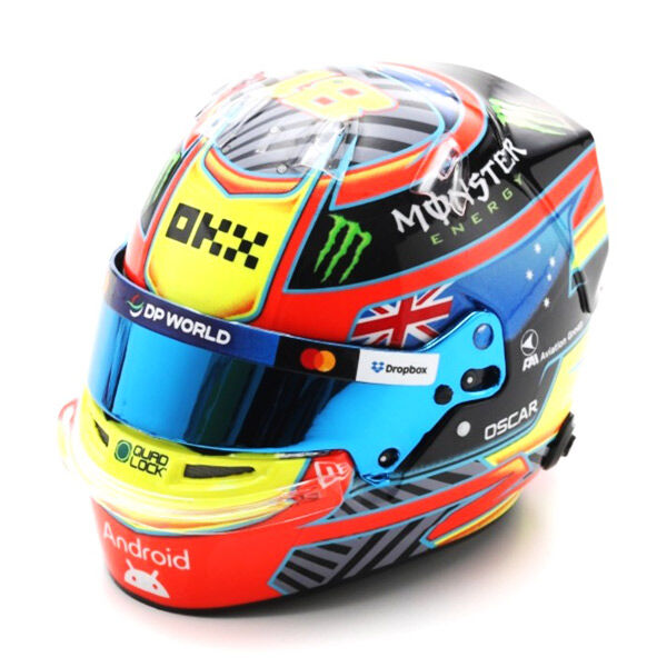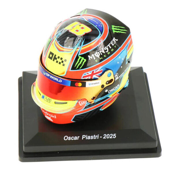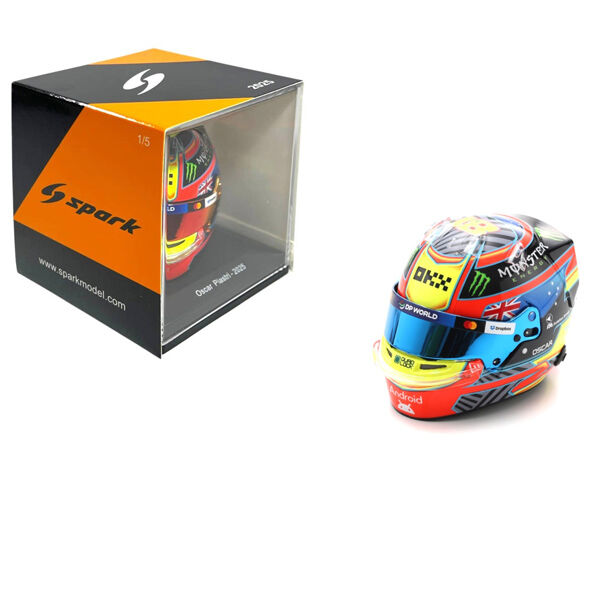 Celebrate the 2025 Formula 1 season with this Spark 1/5 scale replica helmet of Oscar Piastri, designed in the bold and vibrant McLaren Racing colours. Expertly crafted to mirror every detail of the Australian driver’s official race helmet, this collector’s piece features accurate sponsor logos, a tinted visor, and a high gloss finish that perfectly captures the look and feel of the original.