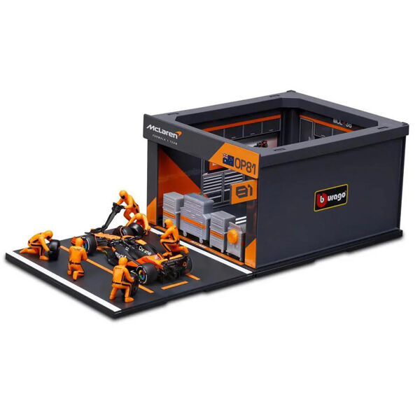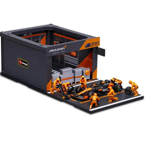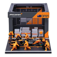 The Burago F1 McLaren MCL38 2024 Oscar Piastri Pit Pass Diorama. Bring home the excitement of the 2024 F1 season with this 1:43 scale diorama featuring the 2024 McLaren MCL38 car and its pit crew during a high speed pit stop. Every detail, from the sleek car design to the focused team mechanics, captures the heart pounding energy and precision teamwork that make McLaren F1 a powerhouse on the track.