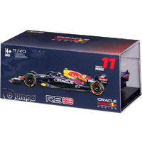 Highly detailed model of the RB18 car driven by Sergio Perez in 2022. This 1/43 scale diecast replica perfectly recreates the distinctive shape of the F1 car, capturing every aerodynamic curve and line as it can be seen on the real vehicle. The level of detail on the surface is incredible, with authentic sponsor and race decals perfectly recreated.