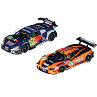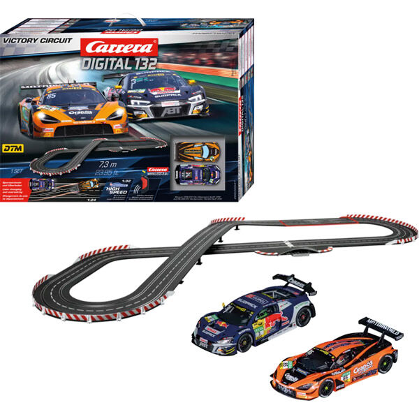 In the Carrera DIGITAL 132 "Victory Circuit" set, the McLaren 720S GT3 "Dorr Motorsport, No. 85" and the Audi R8 LMS GT3 "Abt Sportsline, Kelvin vd Linde, No. 3" , which is available exclusively in this set, engage in a thrilling duel to see who will emerge victorious. In the 2024 DTM season, the McLaren 720S GT3 from the Dörr Motorsport team proved why the car is known for its remarkable speed and excellent handling. The Audi R8 LMS GT3 Evo II from Abt Sportsline, driven by the experienced drivers of the Kempten based team, was also able to demonstrate its excellence on the track.
