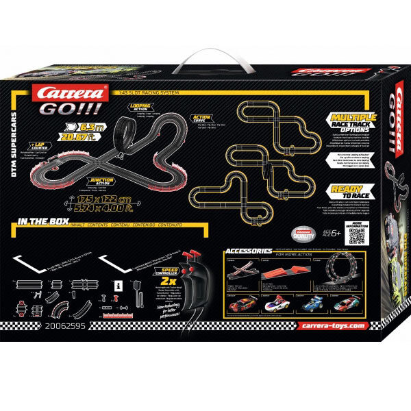 The Carrera GO!!! set DTM Supercars brings the thrilling world of DTM straight into your home: On the 6.3m long track track, the Audi R8 LMS GT3 Evo II DTM "R. Feller, No.7" and the Lamborghini Huracan GT3 Evo II "Mirko Bortolotti, No.92" go head to head. Both 1:43 scale supercars engage in breathtaking duels on a race track featuring a loop, fly over, intersection, and challenging corners. The turbo hand controller ensures the perfect speed, while precise control and exciting manoeuvres in tight sections enhance the racing experience. Whether on the long straights or racing quickly through the loop, this set brings plenty of thrills and authentic motorsport action to the Carrera GO!!! world.