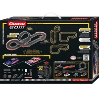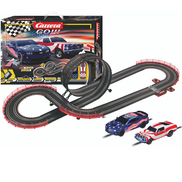 Race head to head with this high speed, 1/43 scale analogue slot car racing toy set featuring your favourite American muscle cars! The Carrera GO!!! slot car racing system offers big fun in a smaller scale. Each set comes with everything you need to start racing and having fun. This set includes a lap counter to keep track of the leader and a junction track for even more challenge and excitement! Rated for ages 6 and up, kids and adults alike will get countless hours of fast racing fun! Cars included are officially licensed.