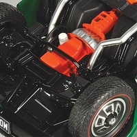 The front chassis shows the engine sump, exhaust system and working suspension. The front wheels are even linked to the steering wheel.