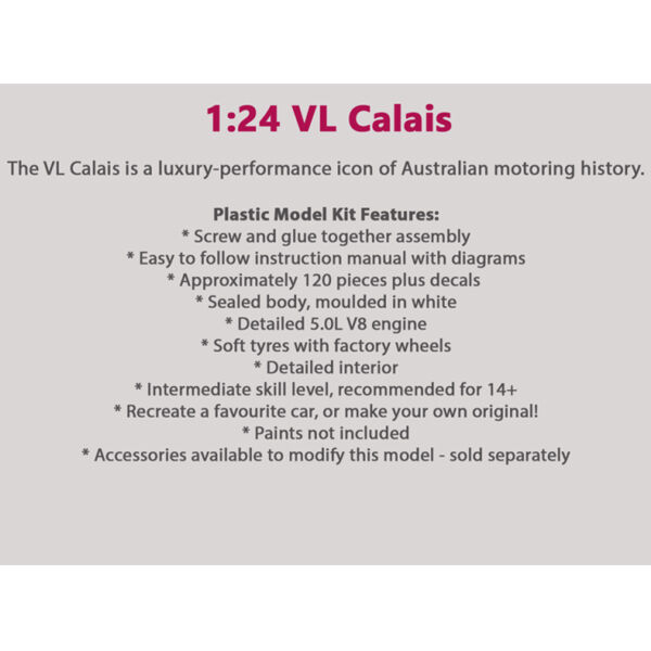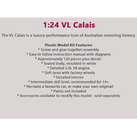 This kit includes approximately 120 plastic and rubber parts ready for you to build your very own 1/24 scale Holden VL Calais.