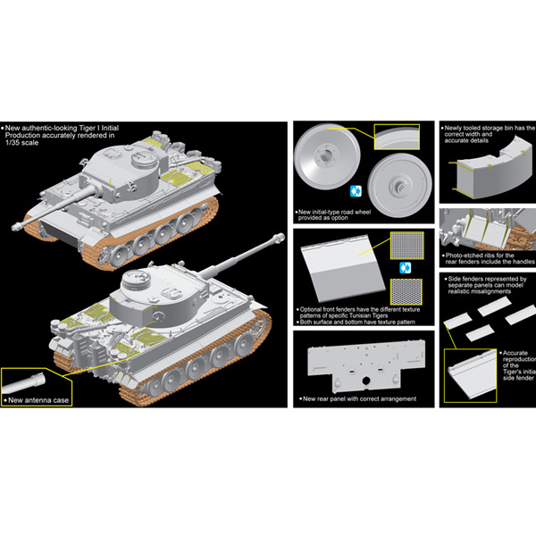 The Tigers of the 501 Heavy Battalion led several battles against American, British and French forces, including Sidi Bouzid. Sent to Tunisia in November 1942 to bolster Rommel’s army, they inspired “Tiger phobia” in the allied tank crews. Whether in the open desert of the south, or the hills and farms of the north, they were a decisive weapon. These Tigers with their outsize turret numbers, their green “tropical” camouflage and their prototype equipment, have a unique appearance. Dragon has incorporated new research into this model, accurately reproducing the most famous veteran Tigers of the 1st Company.