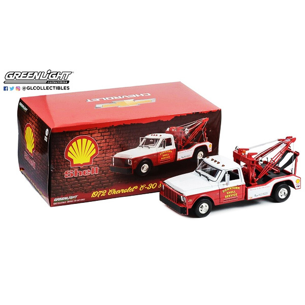 This Greenlight 13654 1:18 1972 Chevrolet C-30 Dually Wrecker from Downtown Shell Service is perfect for collectors and car enthusiasts alike. The attention to detail in this diecast model is impressive, with features like a functioning tow arm and realistic decals.