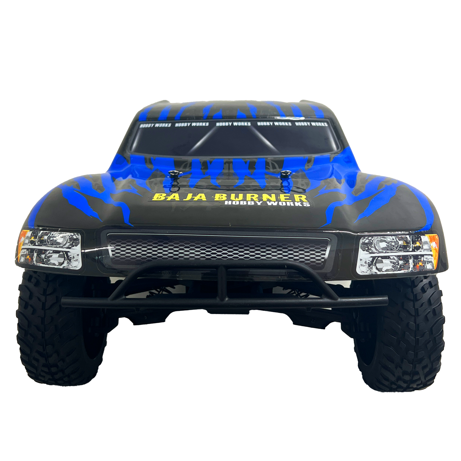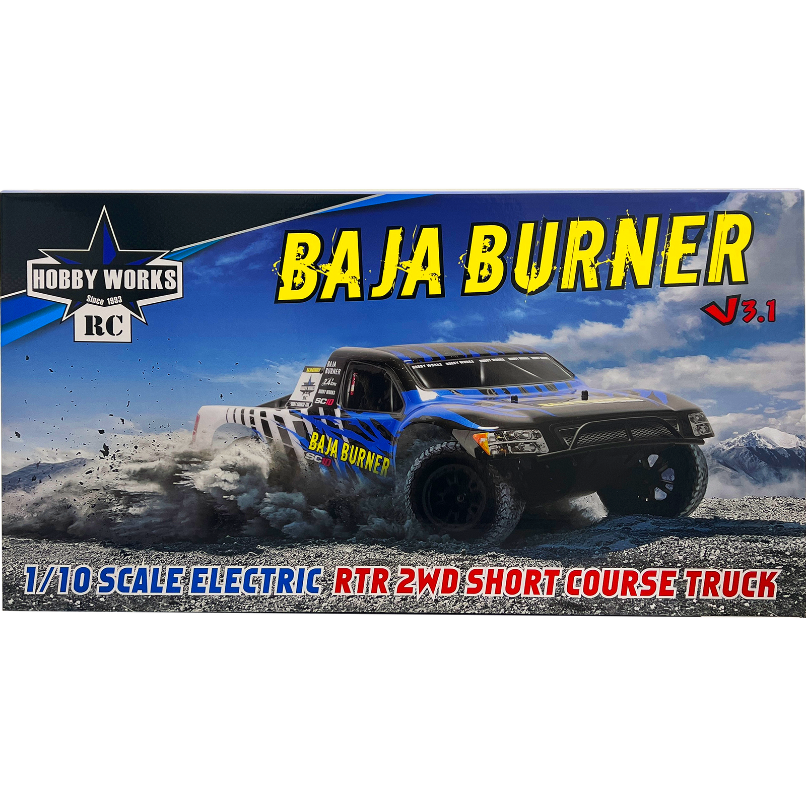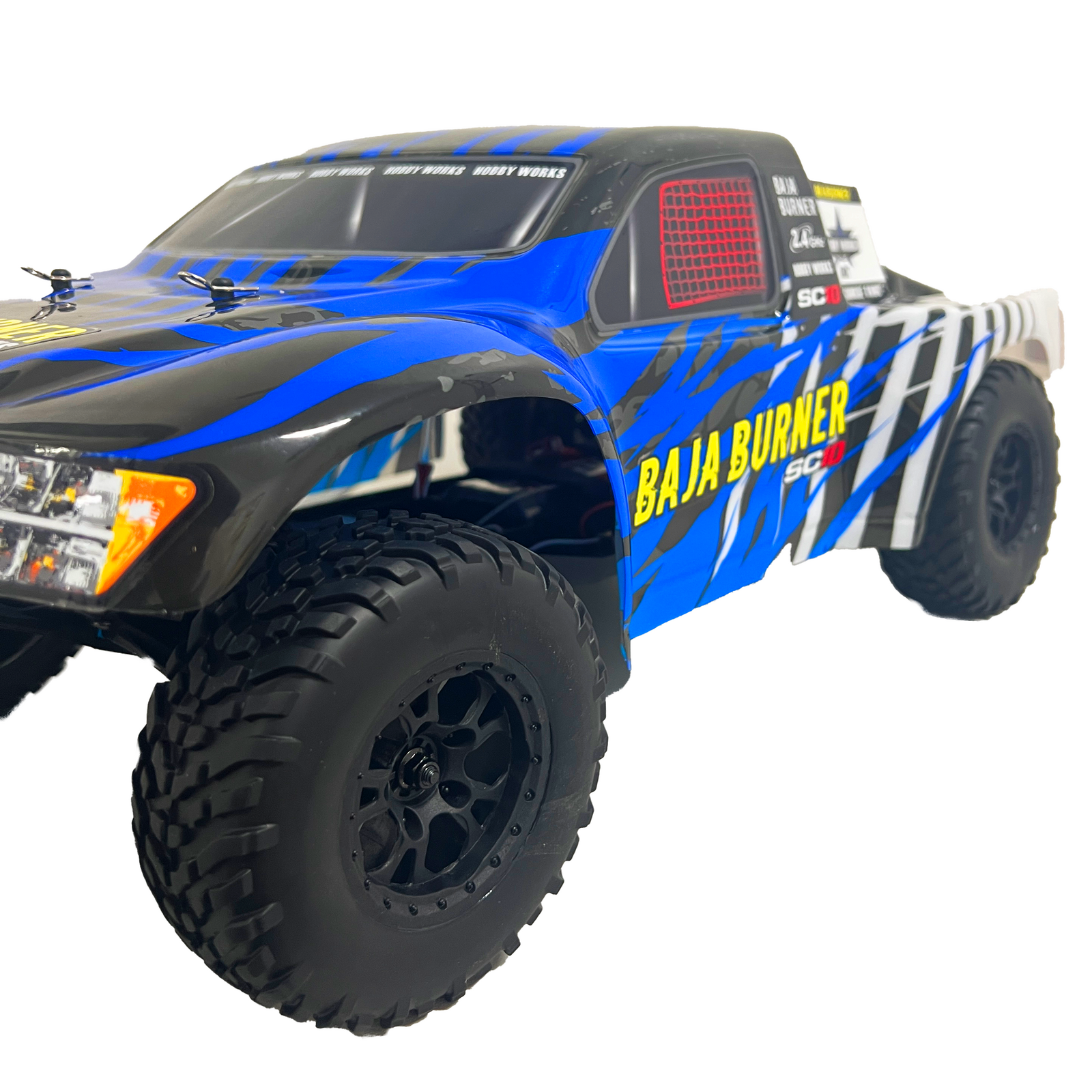 The high performance Hobby Works Baja Burner short course race truck puts you in the driver’s seat for intense fender to fender, high flying off road action. 1/10 short course race trucks embody the spirit of Super Truck with their extreme 900+ horsepower racing engines full throttle, dirt roosting power slides, giant suspension travel, and big air jumps. The Hobby Works Baja Burner brings all the action, so you can experience the high speed competition in your own backyard, local BMX track or local RC track. The rear wheel drive Baja Burner is built to fly over jumps and go full throttle through the turns. Baja Burner hangs it out for the best way to challenge your driving skills. The 4 wheel independent suspension has been tuned to replicate the full scale driving and handling experience as closely as possible. The scale appearing tyres provide just the right amount of bite and thick blinding clouds of dirt roost.
