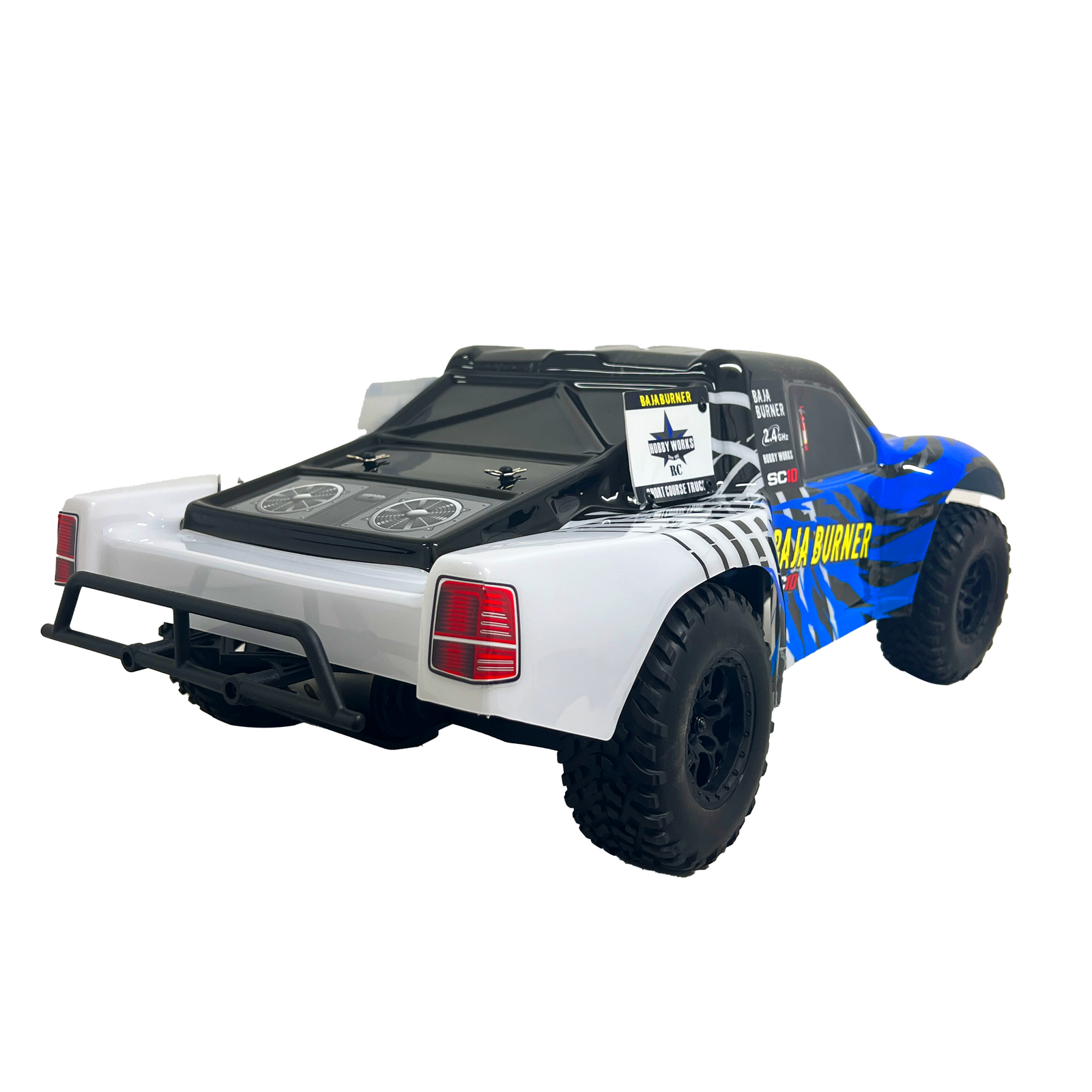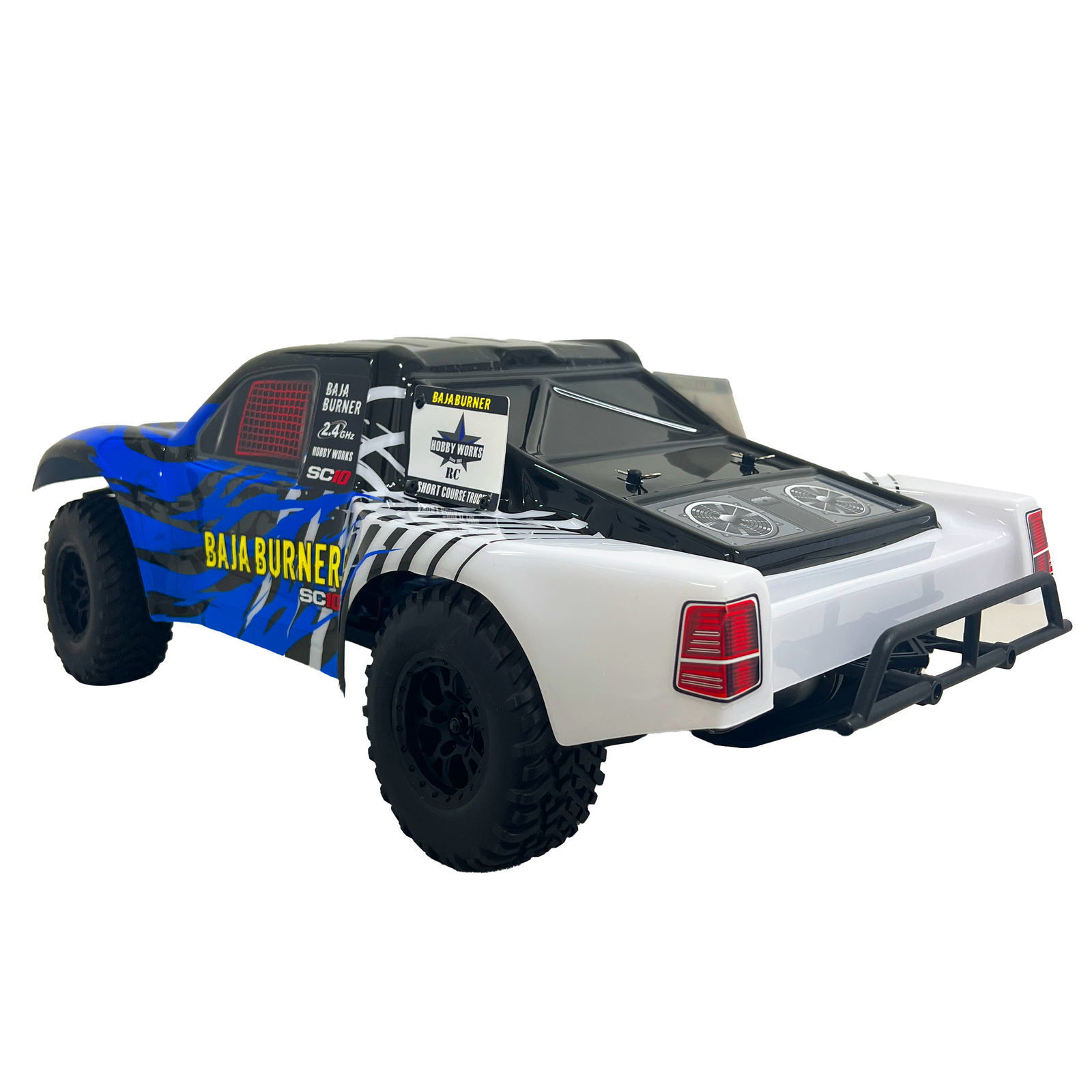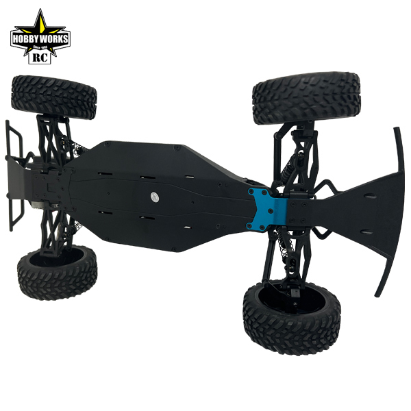 The high performance Hobby Works Baja Burner short course race truck puts you in the driver’s seat for intense fender to fender, high flying off road action. 1/10 short course race trucks embody the spirit of Super Truck with their extreme 900+ horsepower racing engines full throttle, dirt roosting power slides, giant suspension travel, and big air jumps. The Hobby Works Baja Burner brings all the action, so you can experience the high speed competition in your own backyard, local BMX track or local RC track. The rear wheel drive Baja Burner is built to fly over jumps and go full throttle through the turns. Baja Burner hangs it out for the best way to challenge your driving skills. The 4 wheel independent suspension has been tuned to replicate the full scale driving and handling experience as closely as possible. The scale appearing tyres provide just the right amount of bite and thick blinding clouds of dirt roost.