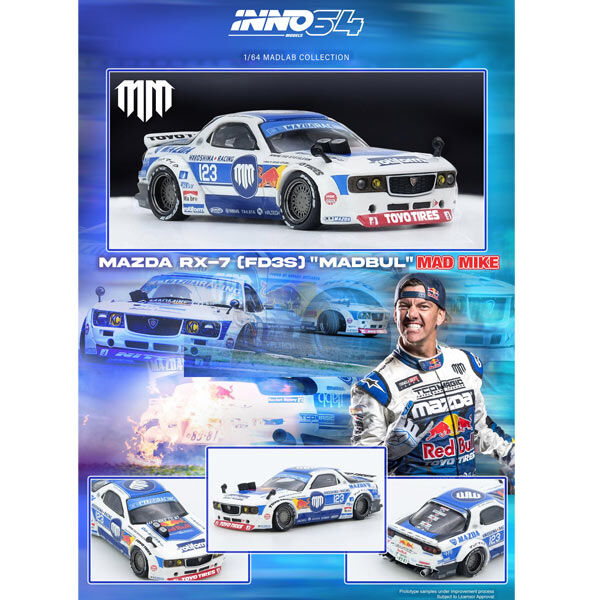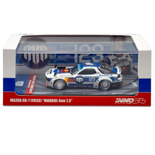 INNO64’s 1/64 RX‑7 captures the iconic FC3S or FD3S chassis outfitted with the aggressive Pandem (Rocket Bunny) wide body kit by TRA Kyoto. Known for bolt on flares, ducktail/spoilers, and deep stance, it’s a JDM tuner classic meticulously rendered in diecast form. Ideal for display on desks, shelves, or in dioramas.
