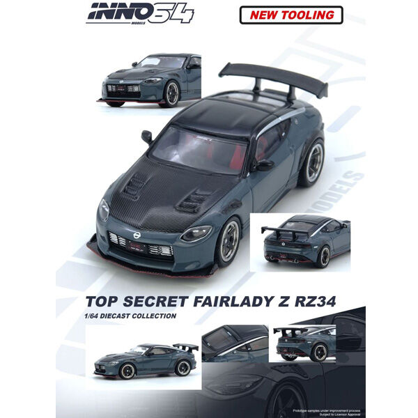 INNO64 1:64 Nissan Fairlady Z (RZ‑34) Top Secret – A meticulously detailed diecast replica of Top Secret’s ultra custom RX‑34 wide body build. This collectible features aggressive aero accents, carbon look carbon fibre style detailing, signature Top Secret sponsor decals, and realistic rubber tyres—all mounted on a sleek display base.