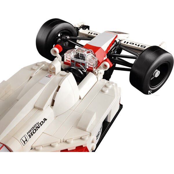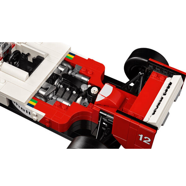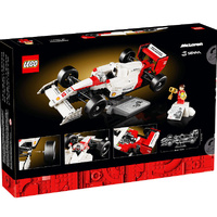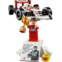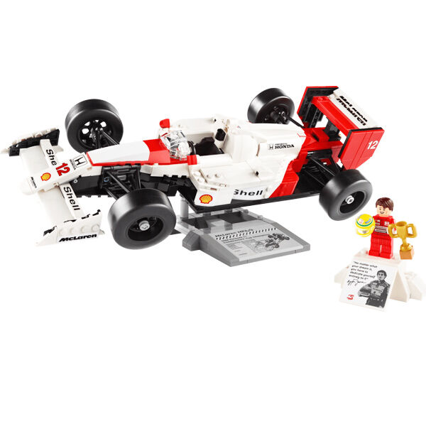 The McLaren MP4/4 replica features working steering, rod suspension, an adjustable rear wing, slick tyres, mirrors, a gear stick and a detailed turbocharged V6 engine, plus a display stand and information plaque with interesting statistics. The Ayrton Senna minifigure comes with a podium style display stand and an information plaque with an iconic Ayrton Senna quote and photo.