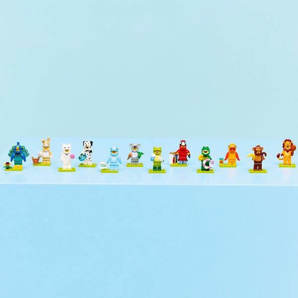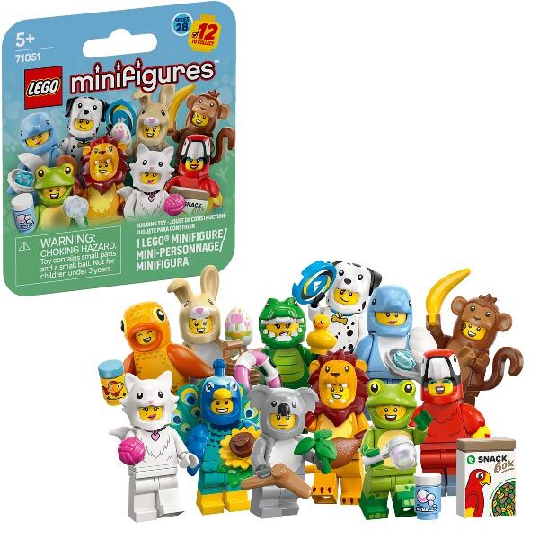 Girls and boys ages 5 and up can play out fun stories with 1 of 12 collectible figures from the LEGO® Minifigures Animal Series 28 (71051) small animal toy mystery boxes. There is 1 surprise LEGO minifigure in each box and a total of 12 charactersto collect including toy figures wearing parrot, lion, frog, crocodile, Dalmatian, goldfish, cute bunny, peacock, fluffy cat, koala, dolphin and monkey costumes. Each of the 12 minifigures comes in a sealed mystery box, and all are accompanied by at least 1 accessory. These detailed cute animal toys can be added to an existing collection, proudly displayed or used to create fun filled stories. This small gift for kids who like animals and nature is a fun treat and inspires great storytelling and countless hours of playtime on their own or with friends.