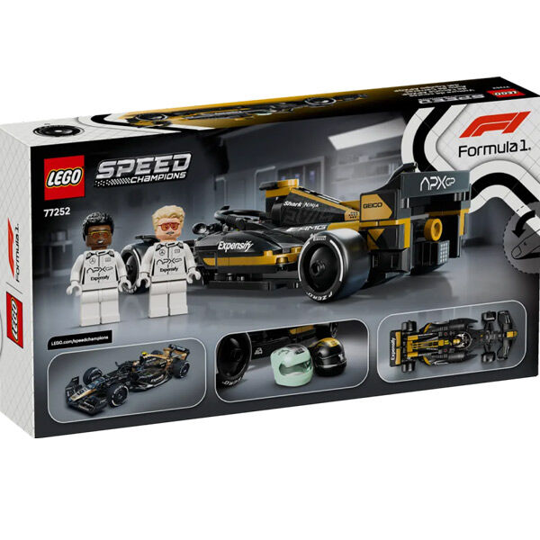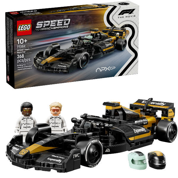 Boys and girls ages 10 and up will be thrilled to build, display and race this LEGO® Speed Champions APXGP Team Race Car from F1® The Movie (77252). This brick built model car kit includes many of the same design details from the version seen in the 2025 movie. This F1 toy car features design details from the movie car including its black and gold livery, sponsor stickers and wider rear tyres imprinted with ’Pirelli’. The race car set also comes with 2 F1 driver minifigure characters from the movie: Sonny Hayes and Joshua Pearce, each with individual helmets featuring their signature, a wig and a wrench, which can also be used to apply stickers and separate bricks. LEGO Speed Champions building sets make great gifts for kids and car fans who can build replicas of some of the world’s most iconic vehicles. They can create each playset with confidence using the LEGO Builder app – zoom, rotate in 3D and track progress with easy to follow digital instructions. Set contains 268 pieces.