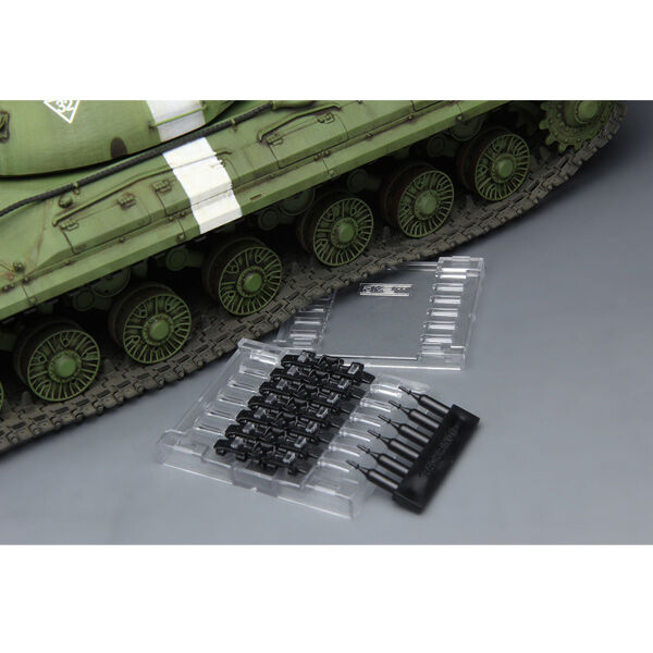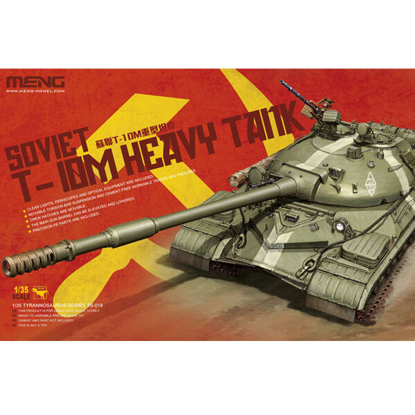 This 1/35 scale Soviet T-10M Heavy Tank plastic model kit offers clear lights, periscopes and optical equipment, movable torsion bar suspension, cement free workable tracks, movable crew hatches, elevatable main gun barrel, precision PE parts and two paint schemes.