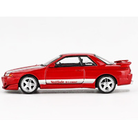 The new Nissan Skyline GT-R is a diecast masterpiece, showcasing aggressive 'Signature Veilside' front bar, side skirts, rear bar and raise ducktail style rear wing, paired with sleek raw machined five spoke dished wheels. This 1/64 scale model features the iconic three stripe Veilside livery and this new variation is finished in metallic ‘Gem Red’ paint. This miniature 1/64 model capturing the essence of early 90's Japanese tuning culture. A must have for collectors and nostalgic JDM enthusiasts alike, this model honours a legendary machine with precision and style.