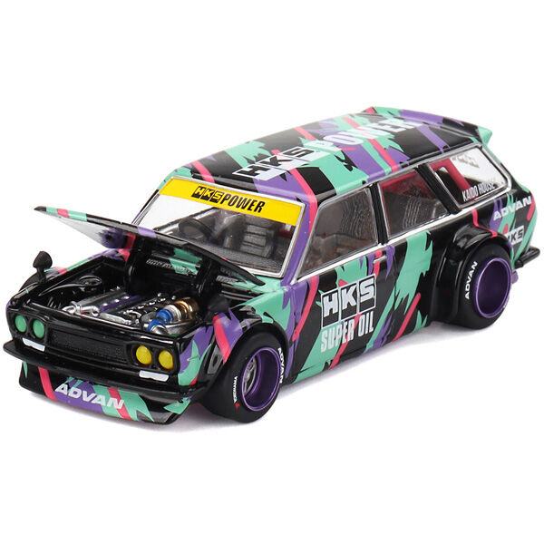 1/64 scale diecast car model of Datsun 510 Wagon RHD (Right Hand Drive) "HKS V1" Black with Graphics (Designed by Jun Imai) "Kaido House" Special