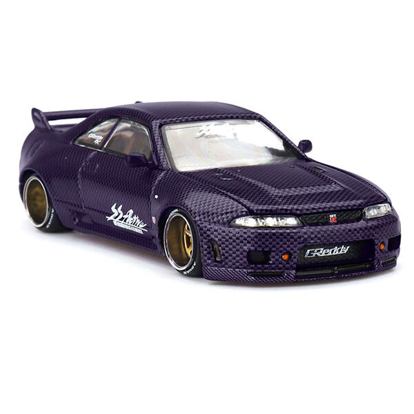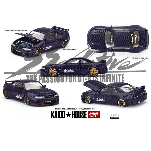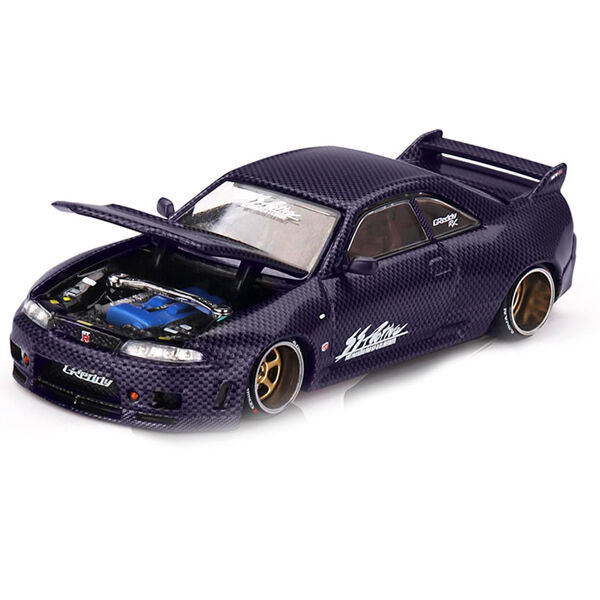 The Kaido House x Mini GT Nissan Skyline R33 GTR Carbon R V2 is a striking diecast model that combines the legendary power of the R33 GTR with Kaido House’s signature carbon fibre inspired aesthetics. This 1/64 scale model features a unique carbon fibre livery, aggressive aero details, and a lowered, race ready stance that accentuates its high performance appeal. With meticulously crafted features like custom wheels, rubber tyres, and detailed carbon accents, this model captures the essence of Kaido House’s visionary design. A must-have for collectors and JDM fans, the Carbon R V2 elevates any collection with its blend of style, quality, and precision.