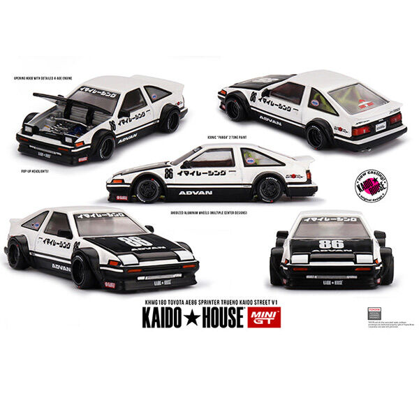 The Kaido House x Mini GT Toyota Sprinter Trueno Kaido Works IMA Racing V1 (KHMG180) is a must have for diecast collectors and JDM enthusiasts. This stunning 1/64 scale model brings together the legendary Toyota AE86 Sprinter Trueno with Kaido House’s signature widebody styling and IMA Racing’s bold racing influence.