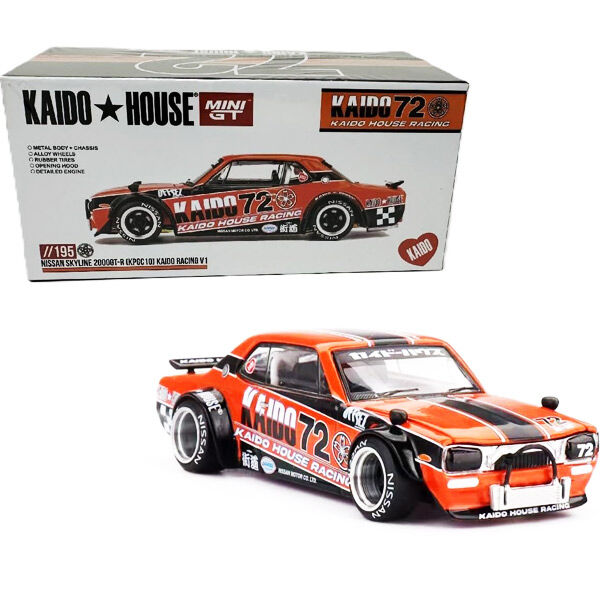 Introducing the new Nissan Skyline 2000GT-R (KPGC10) Kaido Racing V1 - 1:64-scale diecast of the legendary 'Hakosuka’. Dressed in the a new bright orange and black and racing livery, this miniature collectible is a tribute to one of the most iconic classic Japanese JDM cars .