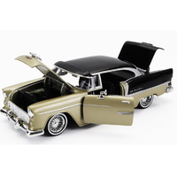 Embrace the allure of the 1955 Chevy Bel Air Low Rider, a golden treasure from Motormax's die-cast collection. This 1:24 scale model, 8 inches in length, is a meticulous replica with doors, hood, and trunk that open to reveal a detailed small block V-8 engine and a fully detailed interior. The custom roof-mounted sun visor, fantastic two-tone paint, and custom wheels highlight its low profile stance. Riding on smooth rolling rubber tyres, this model is not just a display piece but a tribute to the legacy of the Chevy Bel Air, making it a must have for collectors.