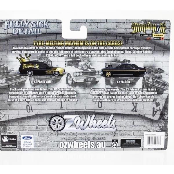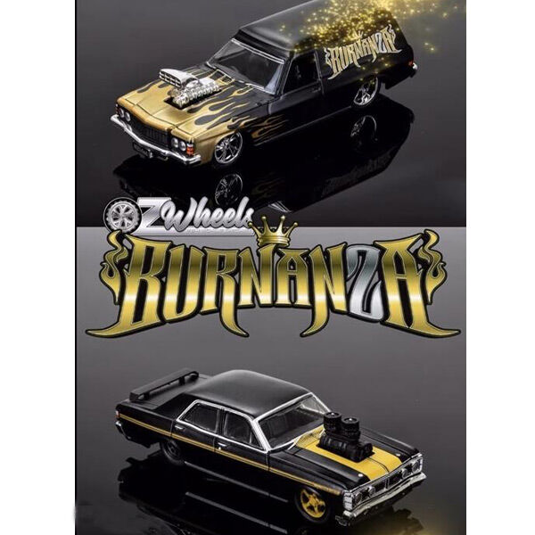 Burnout culture meets diecast with the Ozwheels Burnanza twin pack. Featuring a tough black and gold HZ Holden panel van alongside a blown XY Falcon burnout machine, this 1/64 scale set captures the smoke, noise and attitude of Australia’s street machine scene.