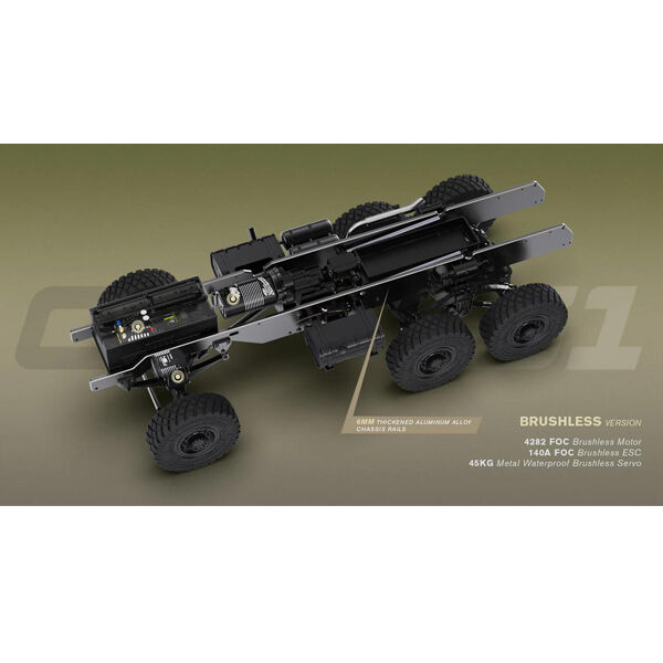 The HY6 truck is not simply a scale model — it is a purpose built heavy duty truck engineered for demanding terrain. At its core are 6 mm thick CNC machined aluminium chassis rails, delivering exceptional torsional rigidity rarely found in RC vehicles. This structural integrity continues to the rear with a one piece 6 mm aluminium cargo bed floor, designed to carry substantial loads without flex or distortion.