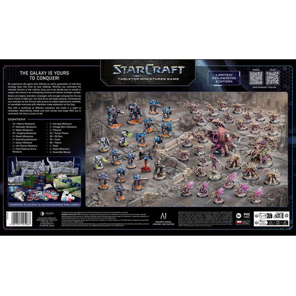 Relive one of StarCraft's most iconic conflicts, this time on your tabletop! This two player starter set lets one side take control of the endless Zerg swarm with Kerrigan - the Queen of Blades at the helm, while the other side plays as the adaptive Terrans, with rebel leader Jim Raynor in control. Build your army and fight for control over key objectives, as every action leaves lasting consequences for the future of the Koprulu sector!