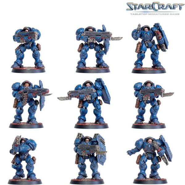 Terran Miniatures -12x Marine miniatures, 2x Marauder miniatures, 3x Medic miniatures, 1x Jim Raynor miniature, 1x Point Defense Drone miniature