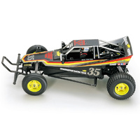 The perfect combination of simple assembly and tough exterior is what made the Grasshopper so special. Durable plastic body is fastened to bathtub resin monocoque chassis by screws, creating a solid frame that can absorb any type of rough handling. Off road tracks can be tackled with ease thanks to coil spring dampers, and independent swing axle front and rigid axle rear suspension. Diff loaded sealed gearbox keeps out the dirt and stones for smooth driving and cornering. Paddle style rear tyres and grooved front tyres combine with 3 piece assembly type wheels for excellent grip performance on dirt tracks. Half body driver figure adds a final addition to a fun off road R/C car.