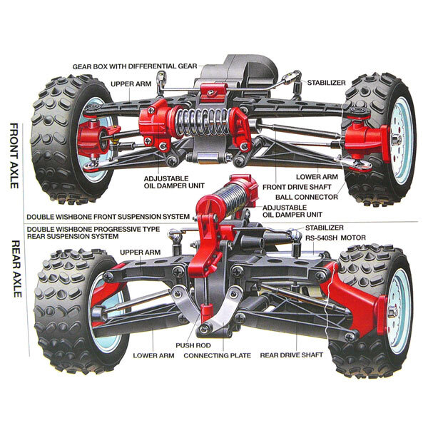 Tamiya designers have given the Hotshot a makeover, replacing older, harder to assemble parts with modern equivalents but still keeping true to the spirit of the original Hotshot. While the front/rear double wishbone suspensions and adjustable mono-shock oil dampers remain the same, the drivetrain features modern dog bone type propeller shafts for enhanced reliability. The oil dampers have also been changed to the more modern diaphragm type. Also, with the use of a modern ESC, the original Hotshot's rear aluminium heat sink was no longer necessary. However, the Hotshot would not look the same without it, so our solution was to install a dummy part to remain faithful to the original look. Take this updated Hotshot out for a spin and compare it to today's R/C buggies to experience how far this hobby has developed!