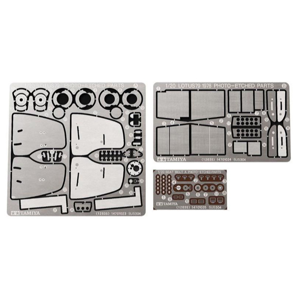 These photo-etched parts set includes photo-etched parts such as brake discs, radiator, front/rear wing panels, body catches as well as metal seatbelt buckles and seatbelt materials to further enhance the realism of the Lotus Type 79 1978.