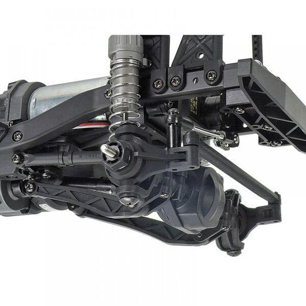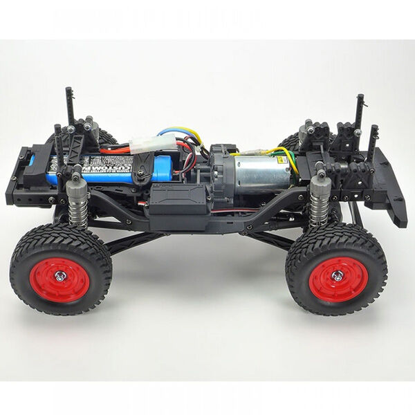Designed for a wide range of off road scenes including rocky terrain, the CC-02 chassis' ladder frame is inspired by full size vehicles and is the base for its superior durability. A 4WD setup employs the motor longitudinally behind the front axle with separated gearbox and transfer case, and propeller shafts transmitting power to the differential gears front and rear. Four link rigid suspension is employed front and rear, with CVA oil dampers for all encompassing control, even on tricky rock sections. This model comes with red wheels and grippy block pattern tyres.