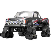 This assembly kit creates an R/C model off-road truck which shows high performance on poor surfaces. Its chassis is based upon the TT-02 shaft-driven 4WD unit, with superlative traction from its four individual tracks that helps it plow through snow, sand, mud and other testing conditions. Its 1980s pick-up truck style body is moulded in polycarbonate, with fog lamps, grille guard and roll bar recreated using separate metal-plated parts. A polycarbonate chassis cover and wheel well liners help prevent dirt and the like from getting into the chassis and potentially causing damage.