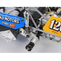 The model's durable ABS plastic box type frame is matched with a battery case which is compatible with modern power sources such as Tamiya Racing Packs and LF batteries. Its four-wheel independent trailing arm suspension is equipped with front and rear aluminium cylinder oil dampers, and the front damper mount is also aluminium. At the rear, the gear differential provides smooth cornering and is housed away from sand and other foreign objects in an enclosed gearbox; low-friction dogbone type driveshafts feature dust boots on their joints for further protection. The silver colour roll bar features metal component, and plated wheels, suspension arms, side guards and gearbox give this buggy a classy finish.