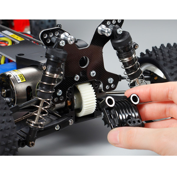 The simple and practical FRP double deck frame sees components mounted on the lower deck for a low centre of gravity. Both front and rear gearboxes, equipped with precision-made ball differentials, give limited slip diff. effect, and provide formidable cornering ability. Hard propeller shaft, and universal shafts increase power transmission efficiency for faster laps around the park. The suspension system features adjustable upper arms that allow camber angle customisation and metal bearings in the steering arms ensure sharp steering response.