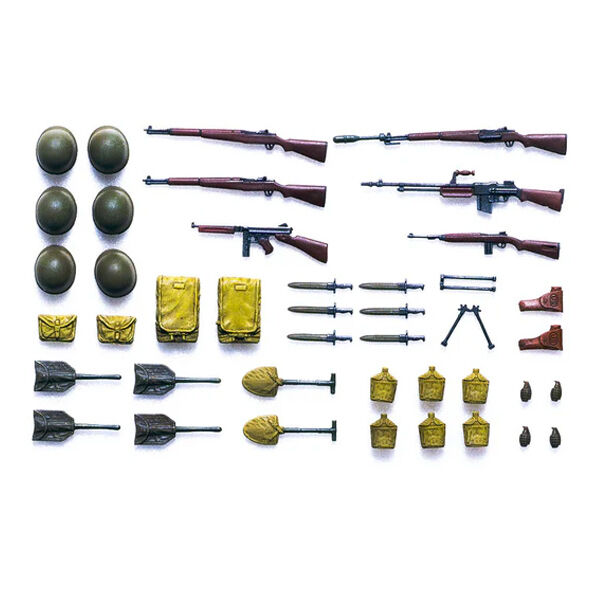 Includes M1 rifles, canteens, grenades, Haversacks, bayonets, intrenching tools, meat can pouches, helmets, M1 Carbines, Browning automatic rifles, M1 rifles with grenade launchers, grenades, holsters, Thompson sub machine guns, and more.