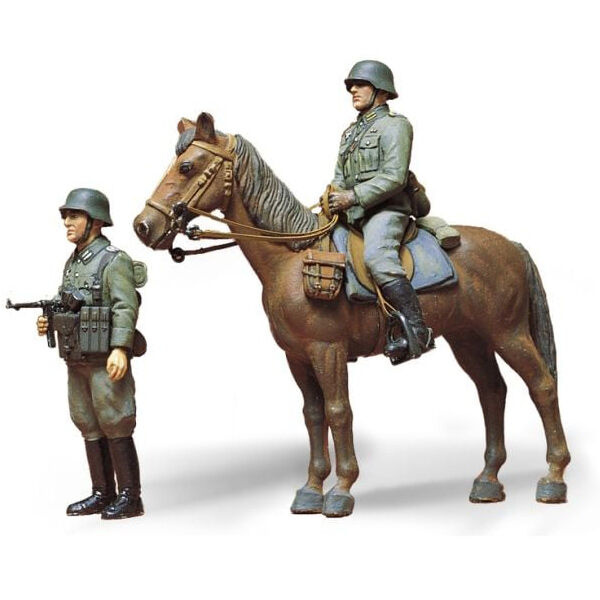 Add some further realism to your dioramas with this plastic model assembly kit of a mounted WWII Wehrmacht officer, horse and accompanying officer on foot with an MP40 sub machine gun.